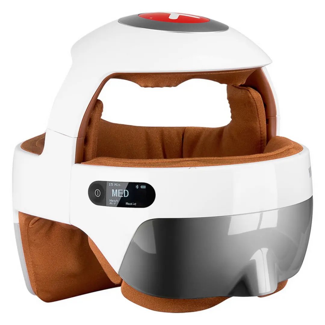 Передняя часть, закрывающая область глаз, - съемная. Временное устранение этого элемента позволяет полностью сосредоточиться на массаже головы. В зависимости от формы, размера черепа, легко отрегулировать высоту роликов, расположенных в теменной зоне. Нужное положение подбирается путем нажатия на кнопку «+/-».